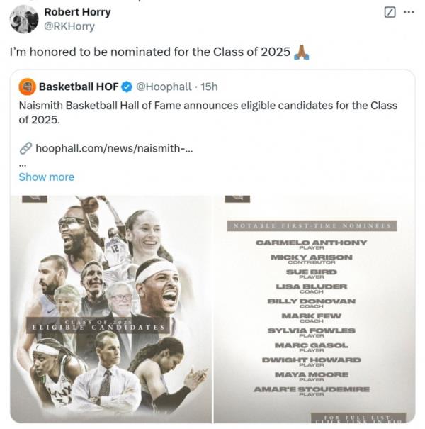 其中,七冠成员罗伯特-霍里在列。对此,他转推评论道:“我很荣幸能够提名2025届奈史密斯名人堂。”